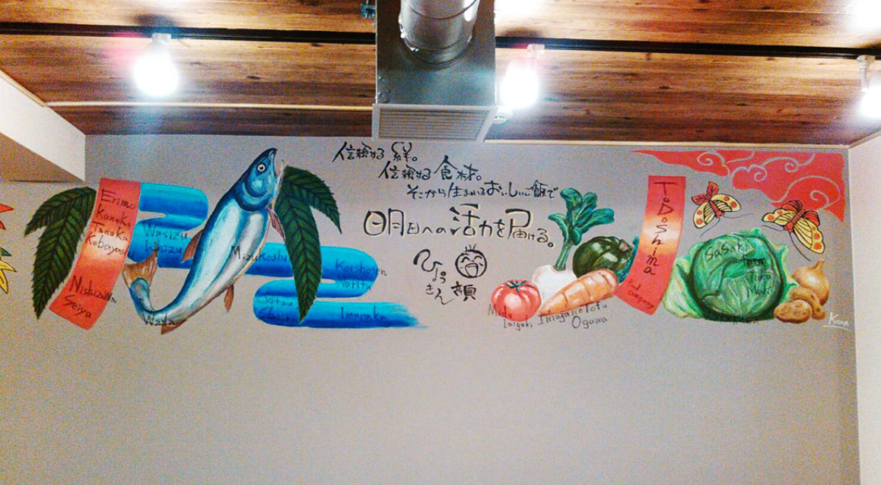 澄川にある、ひょうきん顔さんの壁面チョークアートとロゴを制作させていただきました。